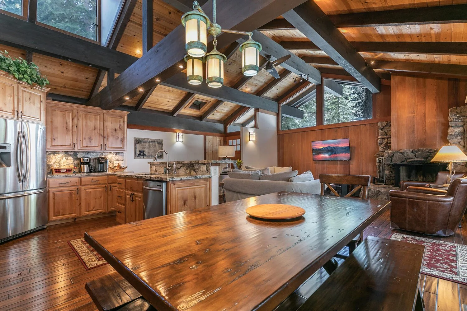 A cozy 2-bedroom + loft condo with lodge-style décor, vaulted beam ceilings, rock fireplace, retro kitchen, and a private enclosed backyard — perfect for a classic Tahoe getaway.